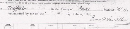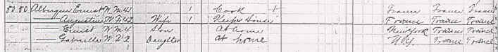 Here is a copy of the exact page from the 1875 NY Census. The family is listed near the bottom. The names are listed as Ernst Albert, Masselin Albert (wife), and Ernestine Albert (daughter). It lists their ages as 37, 38 and 15, respectively, which would have been their ages at their next birthdays. Their neighborhood was predominantly German (obvious from all the other entries in this district) . Perhaps the census taker was also German and had trouble getting the names and spelling accurate, especially since the family probably spoke little or no English.. Also note that Ernest is listed as a "Gardinier" and as an "alien". Five years later the 1880 US Federal Census was taken. By now, Ernestine is no longer in the household but both Ernest George and Gabrielle have been born. Ernest (father) is now listed as a cook.. It is not clear why Victor Jules (older son of Augustine) is not listed in the household in June 1880 unless he was not in the US at the time. He (who was known as Jules), however, entered the seminary in Buffalo, NY, October 1, 1880. He left the US within the next few years to finish his studies in France. See the excerpts from the actual census pages below.