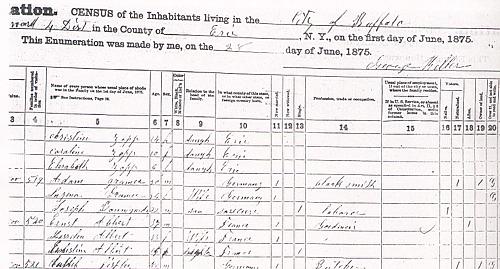 Living in the United StatesThe first documented presence of the family in the United States occurs in Buffalo, New York. They are listed in the city directory in 1874 and appear in the New York State Census of 1875. In this census page, Ernest, Augustine and Ernestine are listed. There is no mention of Helene. By this time Ernestine (daughter of Augustine and her first husband, Jules Nicholas) was about 15 years old. We believe Helene remained in France. (At least there is no trace of her so far in the US.) She was still a young child and perhaps was left in France, being too young to travel. No mention is made of Victor Jules, Ernestine's brother, either. However, from Church records we know that he was in a seminary in Buffalo in 1880.