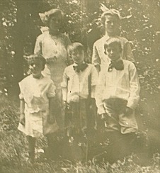 As mentioned above, some time after entering the seminary, Ernest George's older half-brother Jules, moved back to France where Jules finished the seminary and became a parish priest. At some point, Jules' sister, Ernestine, came to live with him as did his half-sister Helene who was his housekeeper. Ernestine died in Coudray au Perche in 1896. Jules died in 1944, leaving his sister, Helene, who died in 1949. Both are buried in Toury, France. See La Famille 2001 for more on Toury, France. Ernest Lucien Alberque, whose family tree appears on its own page (Ernest Lucien), is a cousin of Ernest George's father, Jacques Ernest. Ernest Lucien Alberque is the grandfather of Maurice Alberque, our cousin in France. See the page French Roots for what we know of the ancestry and family trees of Ernest Lucien and the brothers, Jules Nicolas and Jacques Ernest, to date. Ernest George had two wives, Margaret Agnes McNally and Antoinette Anna Grossjung and had four children with each. The family trees for each of his surviving children can be found on their own pages. See tabs at the top of this page for access to each. In addition, information about the family of each of his wives can be found on the page of E.G. Alberque's Wives, Alberque Wives. This is likely First Communion for Rose (front left), Paul (center) and Georgie (front right). It was also probably Confirmation for Cecilia (back right).
