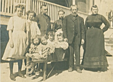 Here is the exact record from the US Federal Census in 1880, taken on June 4, 1880. The far right columns list the person's birth place and birth place of father and mother. Victoire Augustine, known as Augustine, died Jan1, 1892 in New York City when Ernest George was 16 and was buried on Jan. 2, 1892 at Calvery Cemetery in New York. The plot was purchased by her daughter, Ernestine, who was 31 at the time. According to the US Federal Census, June 1900, Ernest George, the son, was married to Margaret McNally and his sister Gabrielle was living with them. They had a daughter, Cecilia, and Margaret would have been pregnant with Ernest George, Jr., at this time. Jacques Ernest (father of Ernest George, Sr.) married a second wife, Catherine, in 1896 and lived in North Hempstead, New York. At some point, he came to live with his son, Ernest George, Sr. and family for many years on Hudson Avenue in Ridgefield Park, NJ. There are family tales that he brought a wife with him (perhaps Catherine, perhaps not) who went insane. He died in 1911 at the age of 72 and is buried in Calvary Cemetery in New York, with his first wife Augustine. (The page Colorful Anecdotes gives an interesting view of the little Frenchman, Jacques Ernest.) NOTE: See the family tree on the page "French Roots" (French Roots) for an outline of this branch of the family. Also, a fuller account of the chronology of the Alberque family appears on the Where They Lived page under the Family Tree tab. The picture below is believed to have been taken in 1910, the year when E.G.'s brother Jules and sister Helene came to visit. That is them behind the cart. The children are likely: Bella and Cecilia, standing; Howard (left) and Lester in the front of the cart; Paul (left) and Rose in the back of the cart. To the right of the cart is probably E.G.'s father, Jacques Ernest. The woman may be his second wife, Catherine, from Ireland, whom Antoinette said went insane and had to be put away. ("Given the black bottle" were her exact words!)